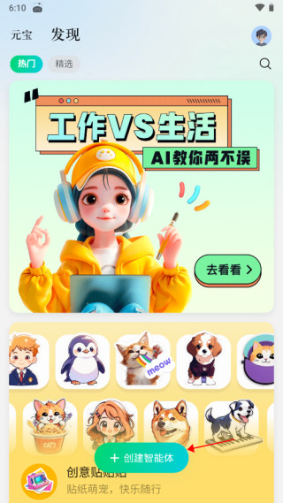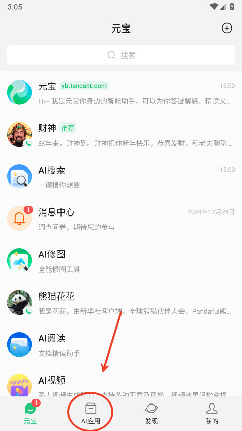 1.进入腾讯元宝之后,跳过前面之后,在主页点击“AI应用”;