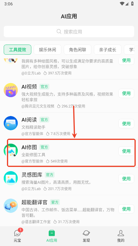 1.打开腾讯元宝在主页,点击“ai修图”;