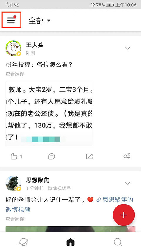 1、打开微博极速版,点击左上角“三条横线”选项,