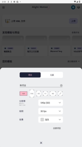 1、打开Axcven剪辑,点首页中间加号创建项目,可设名称、比例、分辨率、帧频及背景;