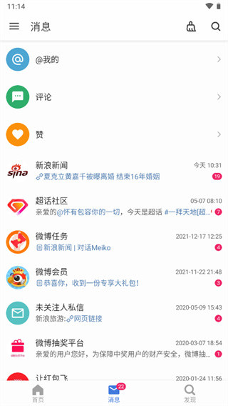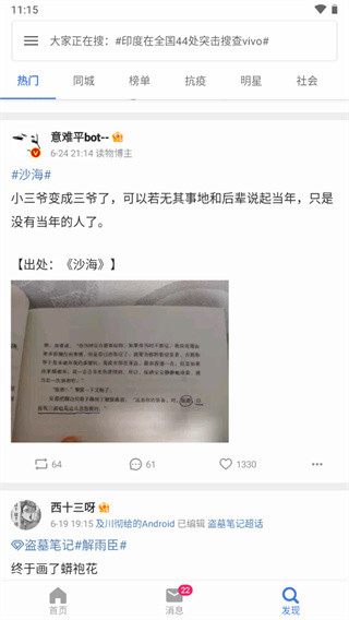 4、在发现界面可查看其他相关种类的微博,比如说“热门”、“同城”、“榜单”、“抗疫”、“明星”、“社会”等等。
