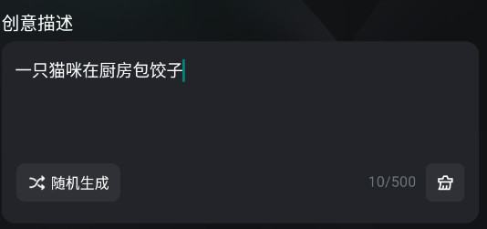 2、输入你想要的描述内容,支持中英文输入,字数不超过500个字符。如果灵感不足,也可以选择随机生成。建议提供详细、清晰的提示词,结构可以按照:“主体+行为、特征、情景、情感+时间+环境+动作+质感、构图、色调、细节”的方式来编写。