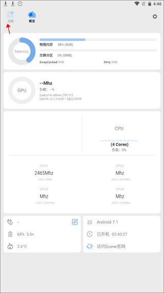 3、在这里显示了帧率记录、充电统计、耗电统计等功能,你可以点击下方红色箭头指向的地方来重新选择工作模式。
