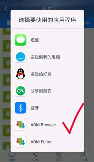 7、找到你要下载的软件,视频,zip,长按,打开为音频,选择ADM,然后点击开始;