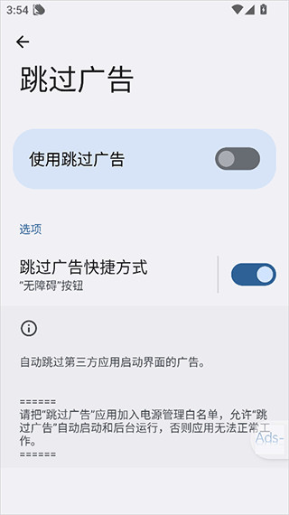 将 AdSkipper 设置为不受限制或加入白名单,防止系统在后台运行时将其清理或优化,以确保它能持续稳定地工作。