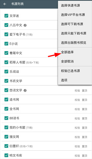 3、接下来在出现的列表中,选择“全部选择”的功能,就能够将已有的书源全部进行添加。