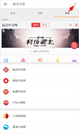 1、需要先选择首页右上方的菜单选项,打开“书源管理”功能。