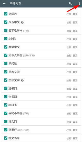 2、然后在书源管理页面里,继续选择右上角的菜单按钮,进行书源的添加管理。