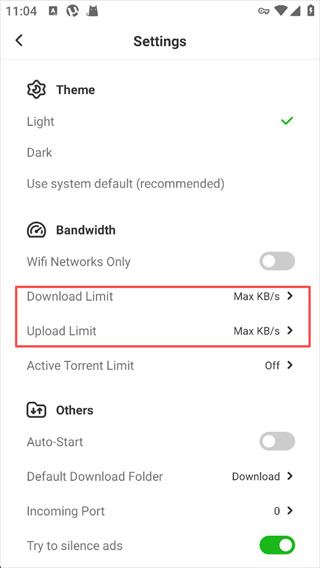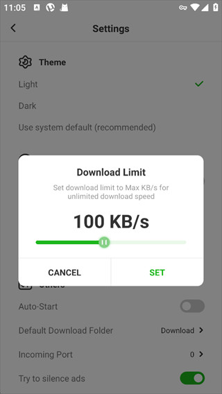 5、调试完成点击【SET】设定。这样当你在安卓上下载种子流时,就会将新的下载速度设置为uTorrent的上限。