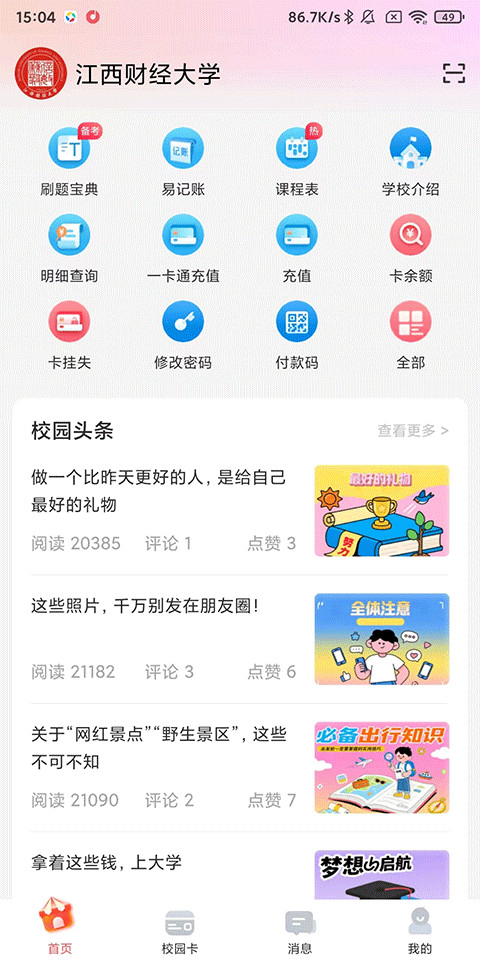 学生可以随时随地在线查卡余额、卡交易明细,在线进行校园卡的充值、改密和挂失。让校园卡的服务更加高效。