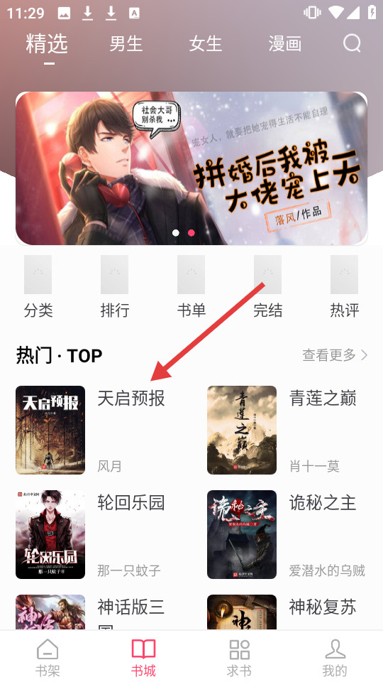 1、在书城热门TOP区域,点击天启预报进入书籍详情页。