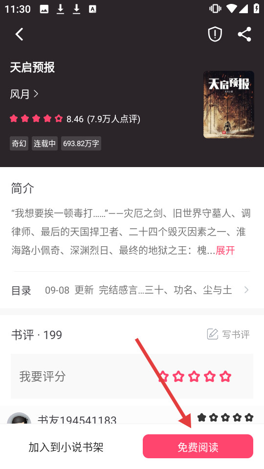 2、在天启预报详情页,点击免费阅读进入阅读页面。