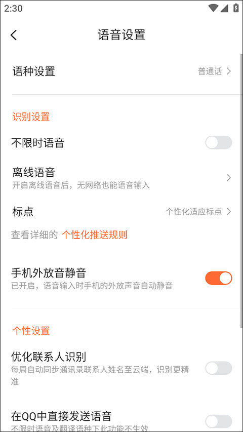 5、在语音设置中,可以对语种进行更换,可以对识别、个性化等进行设置。