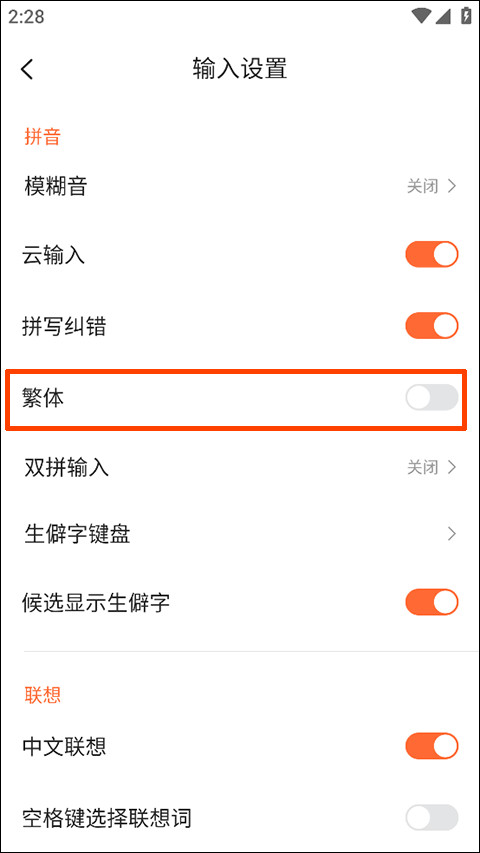 3、然后,在输入设置当中点,亮繁体选项即可开启繁体输入。
