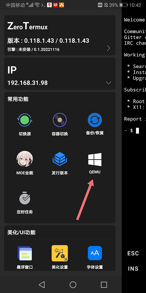 1、等待ZeroTermux启动后右滑界面点击里面的【QEMU】