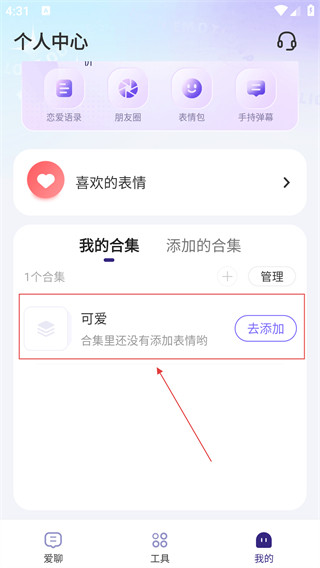 4、点击下方工具,即可进行表情包以及弹幕的添加,有着多种多样的表情包和弹幕可以进行添加,在用户和别人聊天的时候就可以快速发送,而且还有有趣的表情套图可以使用。