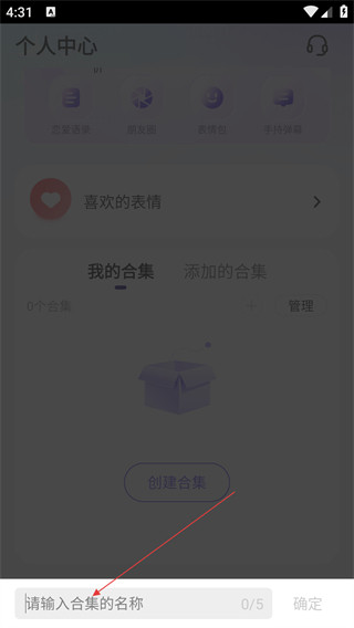 2、在个人中心页面,点击创建合集按钮,弹出合集名称输入框。
