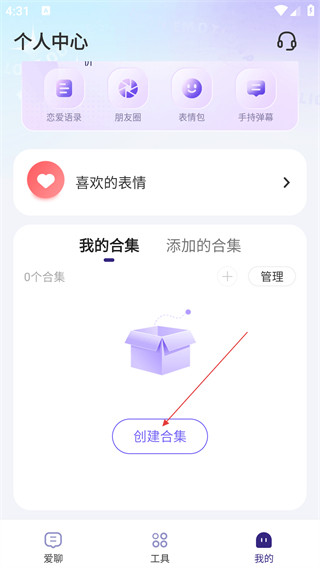 5、点击右下角我的,即可进入个人中心,查看自己的账号信息以及收藏的聊天话术和表情包等。
