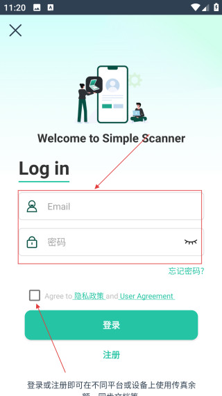 3、在登录页,填写Email与密码,勾选相关协议,准备登录操作。