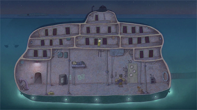 进入三只眼怪物的潜水艇后,通过管道向右移动,来到深海。在左上角会看到穿着潜水服的第四只猫游进画面。