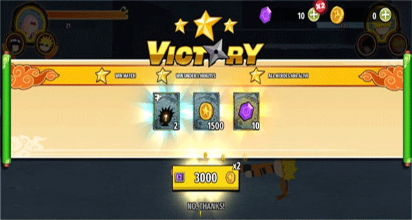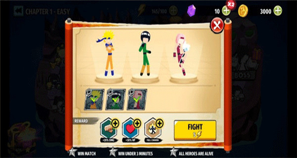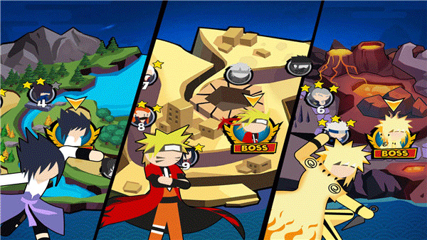 2、玩家可以解锁丰富的游戏角色,你可以自由选择3位忍者出场并调整出战顺序,合理的搭配阵容可以让你更加轻松的赢得胜利;