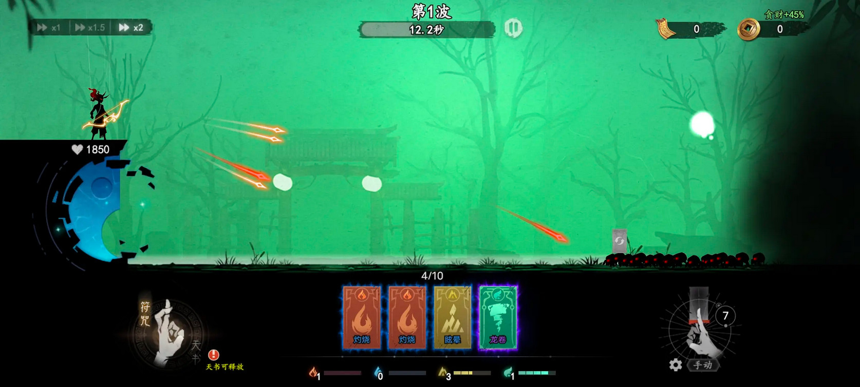 通过合理的管理随机获得的符咒资源,在应对敌人的同时积攒元素能量,释放携带的各类天书,完善战斗策略