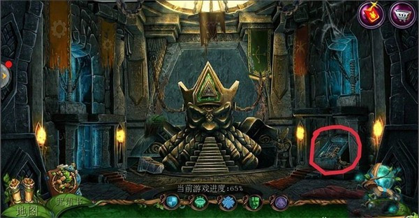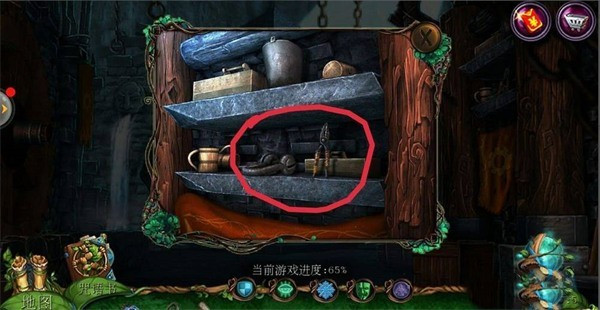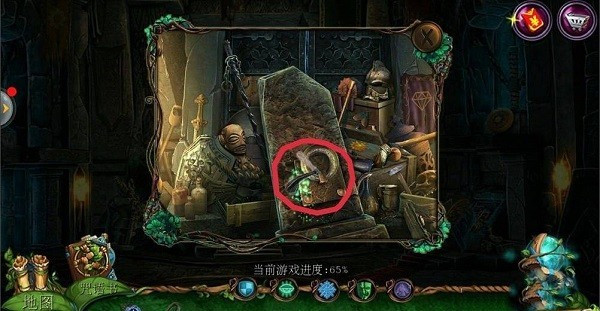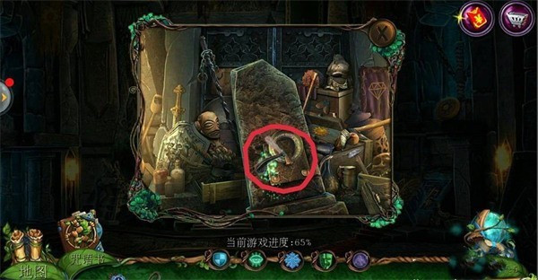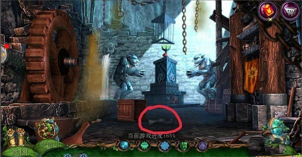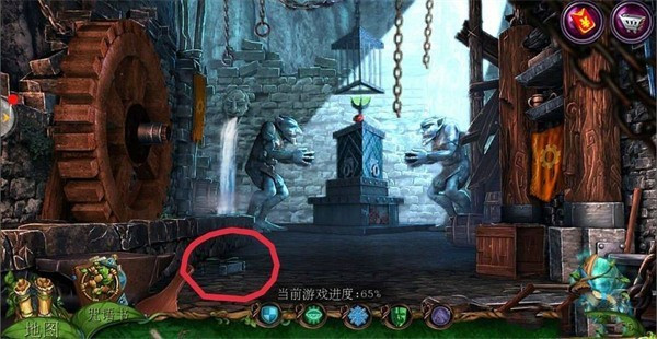 2、点击左边场景哥布林房间,点击中间下面的齿轮;在齿轮旁边拿到铁链,用八边形钥匙打开机关,在地上拿到镰刀。