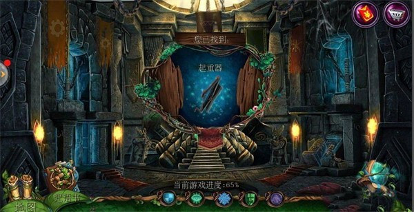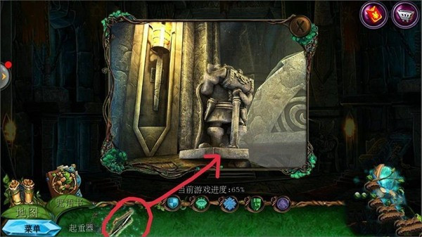 8、点击左边的齿轮,用钳子剪断铁丝;清理掉所有卡住轮子的废弃物;先找到锯子锯掉木棍;再找到钩子钩树叶里的锥子;把锥子放在石头堆里,最后用锤子敲打,移开石堆;完成游戏,拿到起重器。