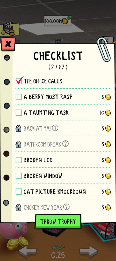 办公室捣蛋鬼是一款休闲解压手游,玩家可以在游戏中向办公室里最烦人的同事砸东西、扔东西,用一切方法来整治他。游戏操作简单,以扔东西砸人为核心玩法,玩家只需要在场景中寻找并点击各种道具,如纸团、咖啡杯和文件夹等,瞄准同事直接投掷即可,砸中即可获得视觉和音效的反馈,十分爽快直接。游戏精准抓住了职场人的心理,点击游玩即可获得快乐,释放压力。
