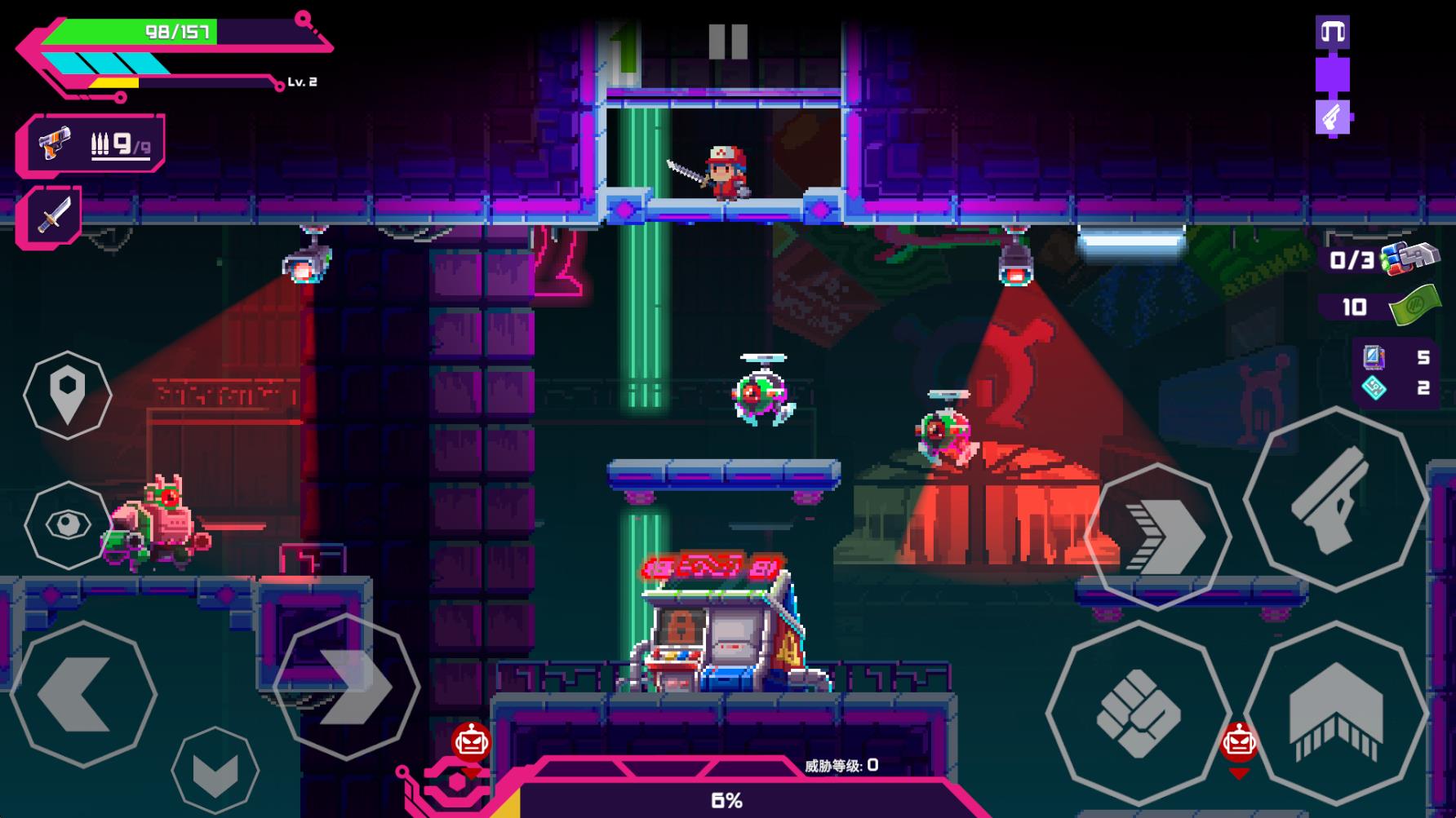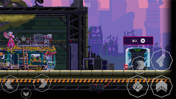 2、左边控制角色的移动和互动,右边是攻击、跳跃、冲刺和射击按键。