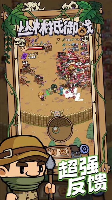 丛林抵御战手游是一款趣味十足的冒险闯关游戏,游戏内的地图、人物和野怪等都十分可爱。玩家需要根据关卡特点,招募不同技能的伙伴、研发科技、打造和搭配装备,组建强大的怪物。进入战斗后需要精准躲避技能、集火目标,以弱胜强。每次进入游戏后都是新体验,关卡、事件和奖励都随机生成,可以搜集资源升级科技树、解锁新伙伴和武器,在游戏中畅快战斗。
