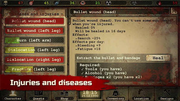 生存之日是一款趣味生存游戏,游戏玩法丰富,任务挑战性十足。游戏营造了一个绝望的末日氛围。玩家不仅要对抗辐射、饥饿和疾病等基本生存需求,还要由怪物和暴力幸存者统治的废墟中生存下来。游戏细节高度拟真,玩家身体部位受伤、疾病感染和烹饪等都十分真实,玩家可以自由体验。游戏地图庞大,任务多而细碎,从瓶盖到每一块布料都需要精打细算,玩家可以自由探索。
