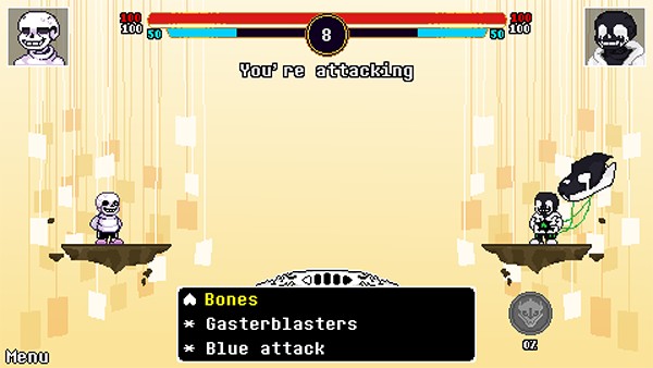 通过攻击积攒能量条,满后触发特殊技能如Ink Sans的墨水攻击、Error Sans的代码破坏等。