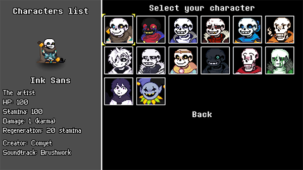 角色通常初始解锁或通过剧情模式解锁,包括高人气同人角色如Ink Sans、Error Sans、Fresh Sans等,每位拥有独特技能与战斗风格。