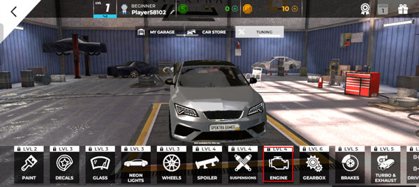 4、在下方找到发动机进行改装,不过改装的时候,你需要升级到4级,改装之后就可以提升马力了。
