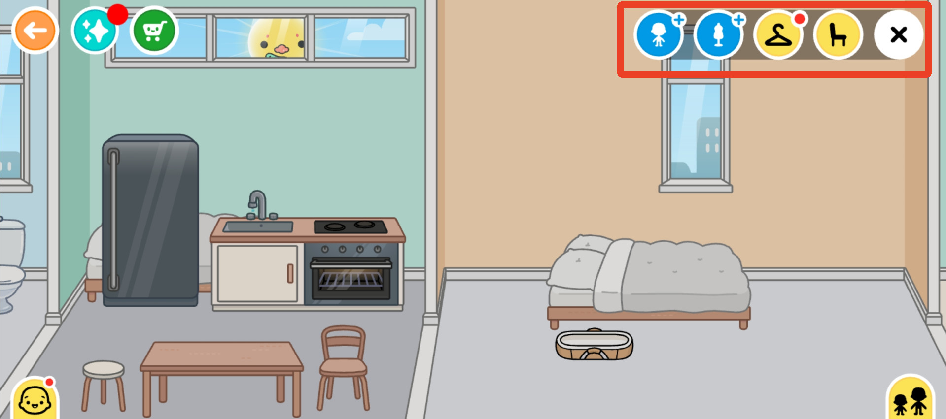 3、进入房子内部后点击右上方图标,查看角色、服装和家具。