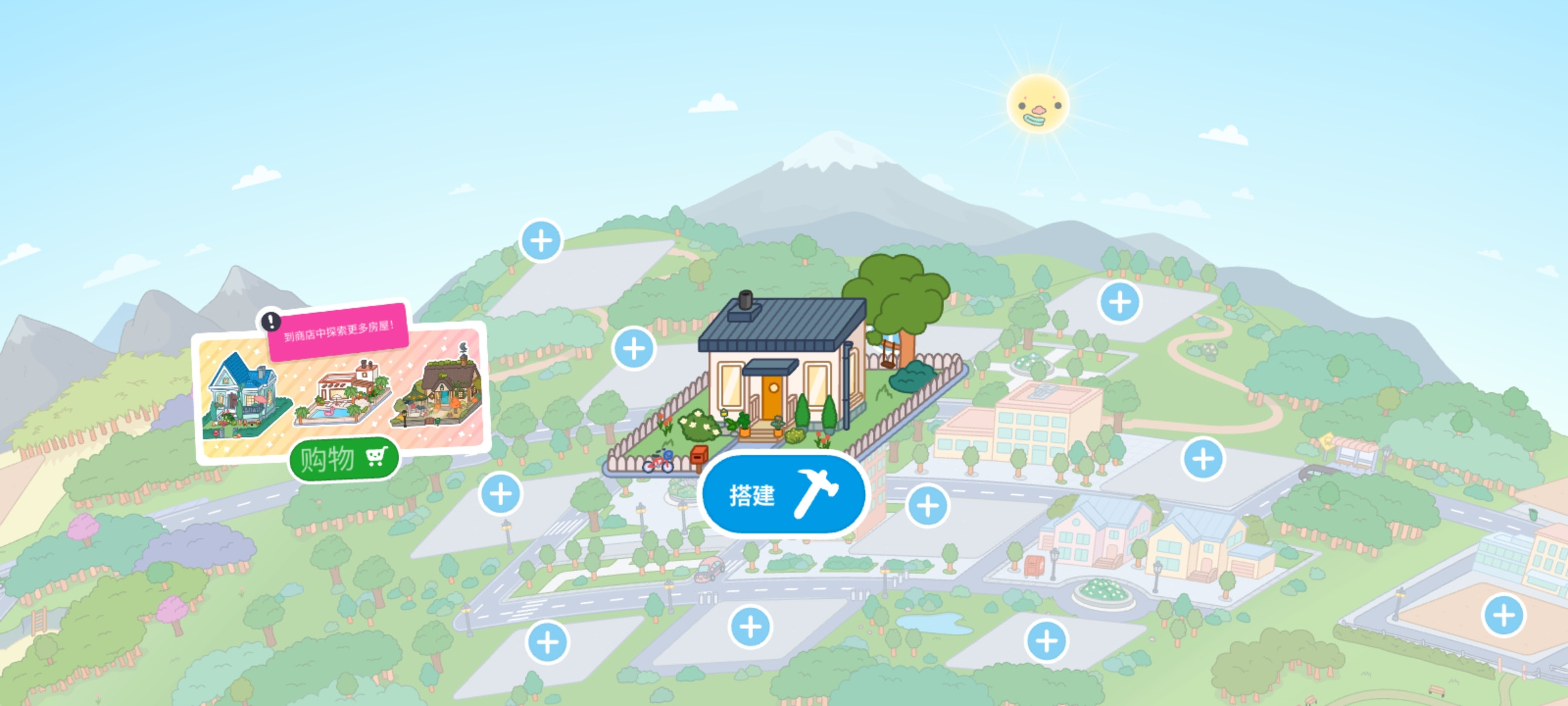 2、选择一个你喜欢的地方,点击+号搭建房子,可以前往商店购买房型,搭建完成后点击房子进入内部开始装修。