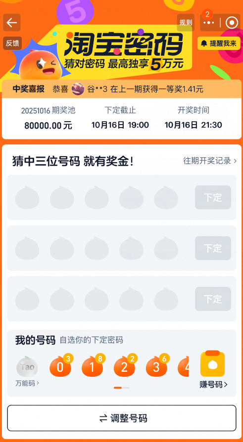 淘宝密码最新94期10月16日开奖,根据以往的数字答案规律猜测密码可能是48191,在淘宝首页中搜索淘宝密码即可进入,然后就可以完成下方的任务来获得数字号码,最后就可以输入数字下定了。