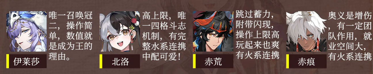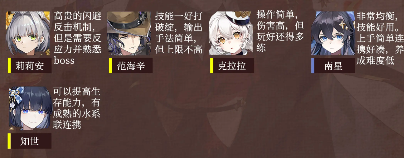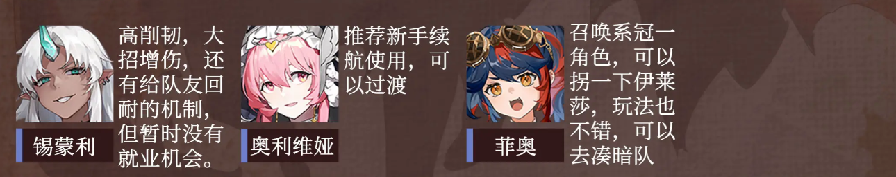 辉烬T0级别的角色伊莱莎、北洛、赤荒、赤痕;T1级别的为莉莉安、范海辛、克拉拉、南星、知世;T2级别角色为锡蒙利、奥利维亚、菲奥;T3级别的有格洛克、柯尔特、欧文。