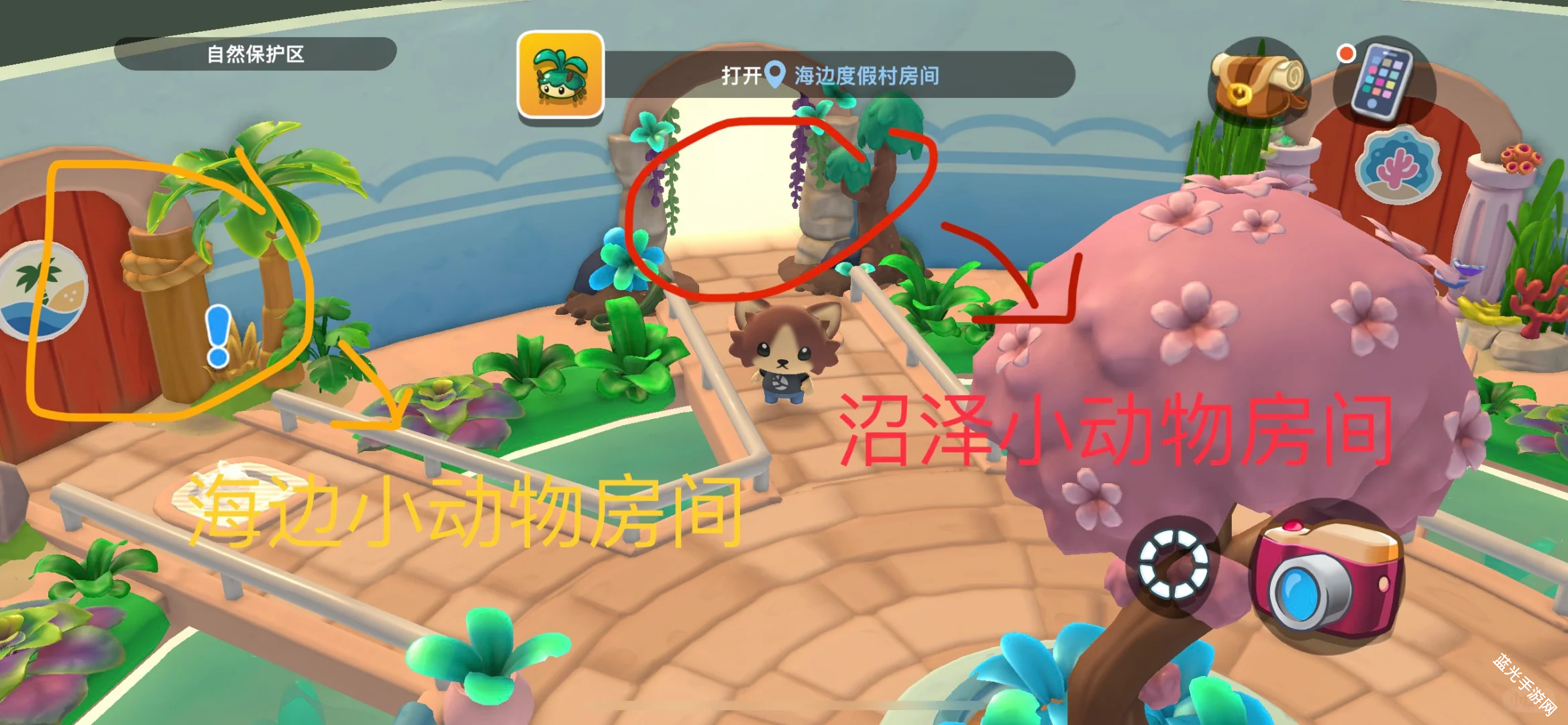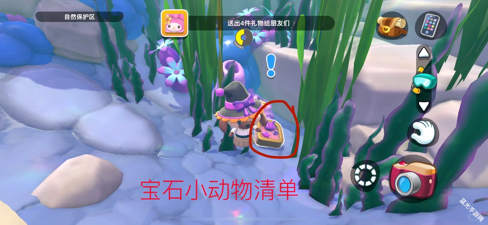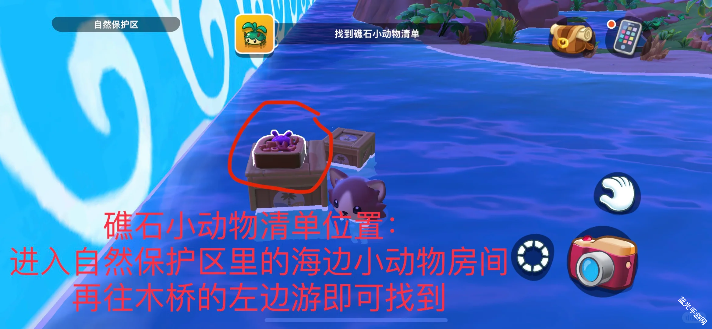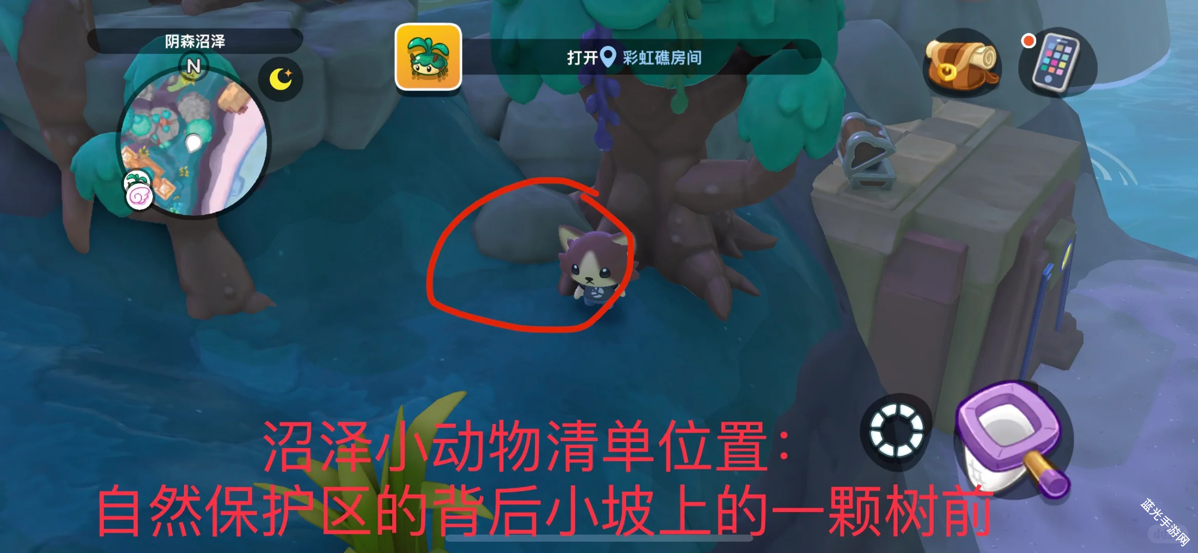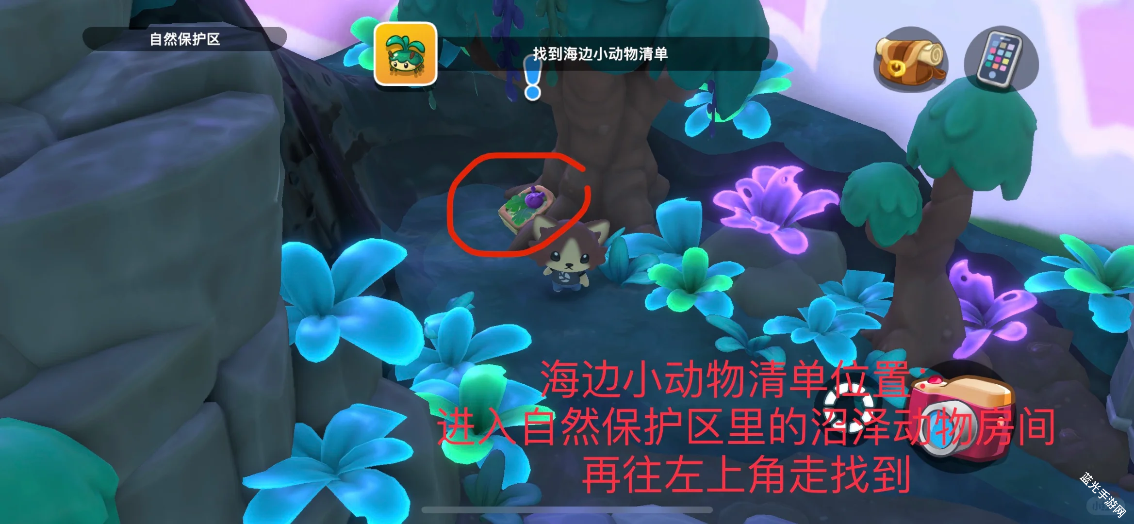 Hello Kitty冒险小岛自然保护区大地图中分布着各个不同的小动物清单,其中沼泽小动物清单在自然保护区的背后小坡上的一颗树前;海边小动物清单在自然保护区里的沼泽小动物房间附近;礁石小动物清单在自然保护区里的海边小动物房间附近;宝石小动物清单在礁石小动物房间下潜。