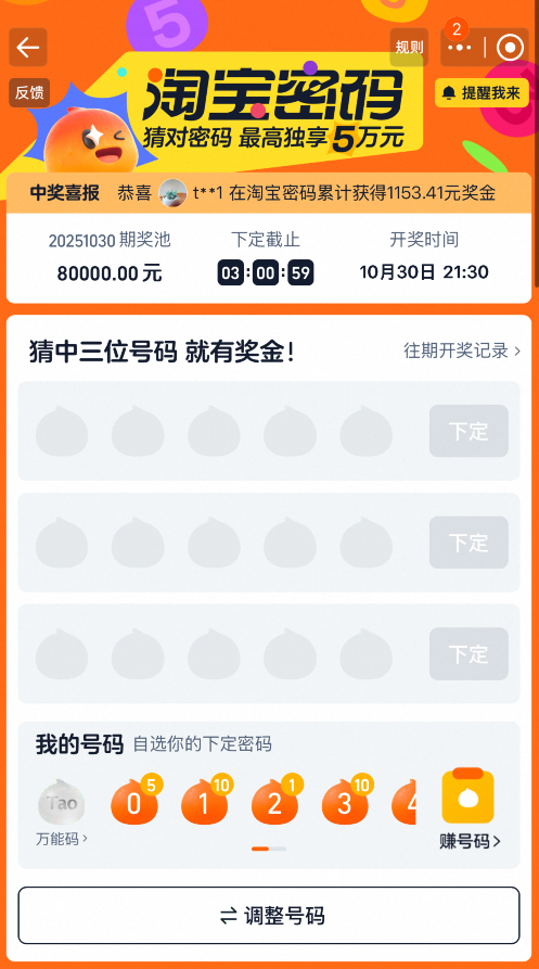 淘宝密码最新98期10月30日开奖,根据以往的数字答案规律猜测密码为84189等,在淘宝首页中搜索淘宝密码即可进入,然后就可以完成下方的任务来获得数字号码,最后就可以输入数字下定了。