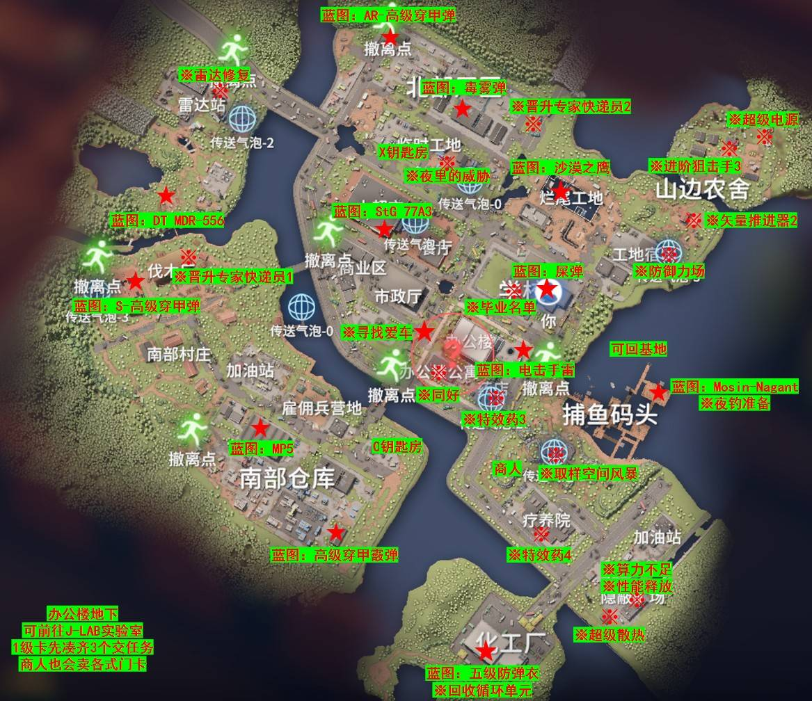 逃离鸭科夫每张地图中都有很多的资源分布,下文是整理的具体关于零号区、仓库区、农场镇、J-Lab实验室、风暴区这几个位置的地图资源分布点位详情!