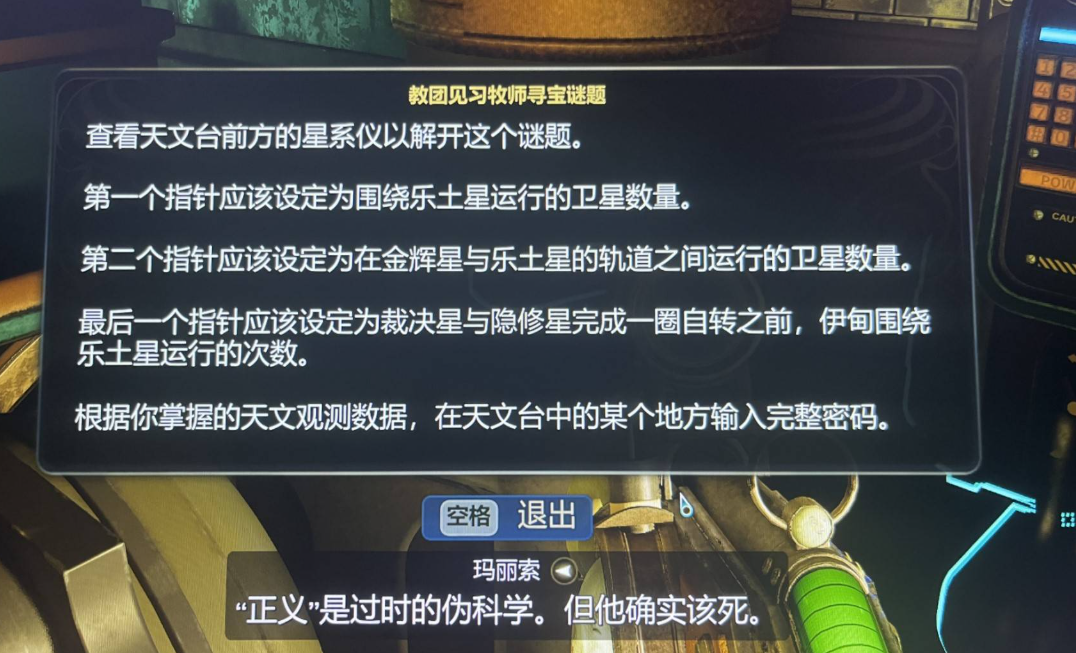 天外世界2中教团见习牧师寻宝谜题需要查看天文台前方的星系仪进行解谜,可以根据房间内那个挂墙上的圆盘,得到有四个卫星,答案是只有伊甸星一个,公转一圈等于伊甸星公转四圈,最终答案为414。