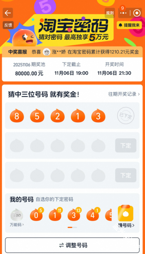 淘宝密码最新100期11月6日开奖,根据以往的数字答案规律猜测密码为85213等,在淘宝首页中搜索淘宝密码即可进入,然后就可以完成下方的任务来获得数字号码,最后就可以输入数字下定了。