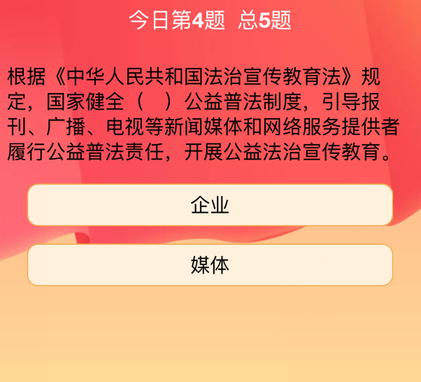 4、根据《中华人民共和国法治宣传教育法》规定,国家健全( ) 公益普法制度,引导报刊、广播、电视等新闻媒体和网络服务提供者履行公益普法责任,开展公益法治宣传教育。