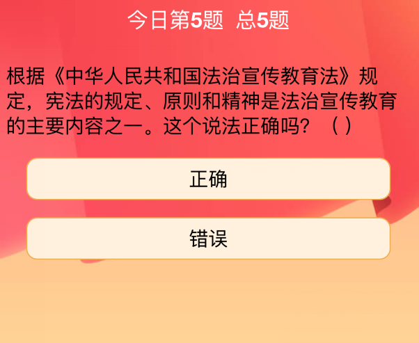 5、根据《中华人民共和国法治宣传教育法》规定,宪法的规定、原则和精神是法治宣传教育的主要内容之一。这个说法正确吗? ( )