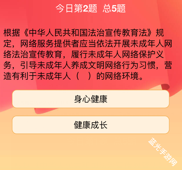 2、根据《中华人民共和国法治宣传教育法》规定,网络服务:提供者应当依法开展未成年人网络法治宣传教育,履行未成年人网络保护义务,引导未成年人养成文明网络行为习惯,营造有利于未成年人( )的网络环境。