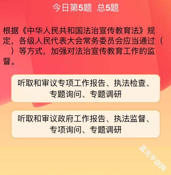 5、根据《中华人民共和国法治宣传教育法》规定,各级人民代表大会常务委员会应当通过( )等方式,加强对法治宣传教育工作的监督。