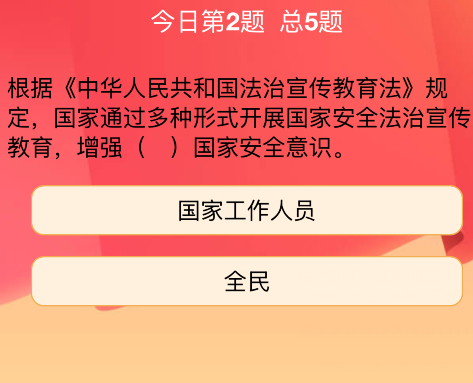 2、根据《中华人民共和国法治宣传教育法》规定,国家通过多种形式开展国家安全法治宣传教育,增强( )国家安全意识。