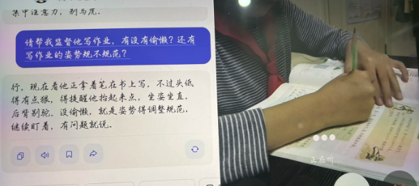 豆包中开启视频通话,并向豆包发送需要她执行的指令,将镜头对准孩子后就可以开始监督孩子写作业了。视频开启后小孩要是有什么其它的小动作或是开小差,豆包也会对其进行提示。